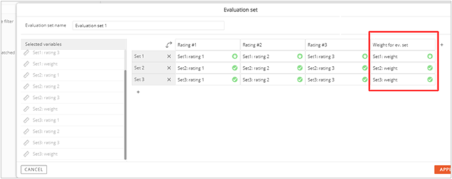 Select the variables to include in the new evaluation set, including the weight variables and proceed with merging the selection into an evaluation set.