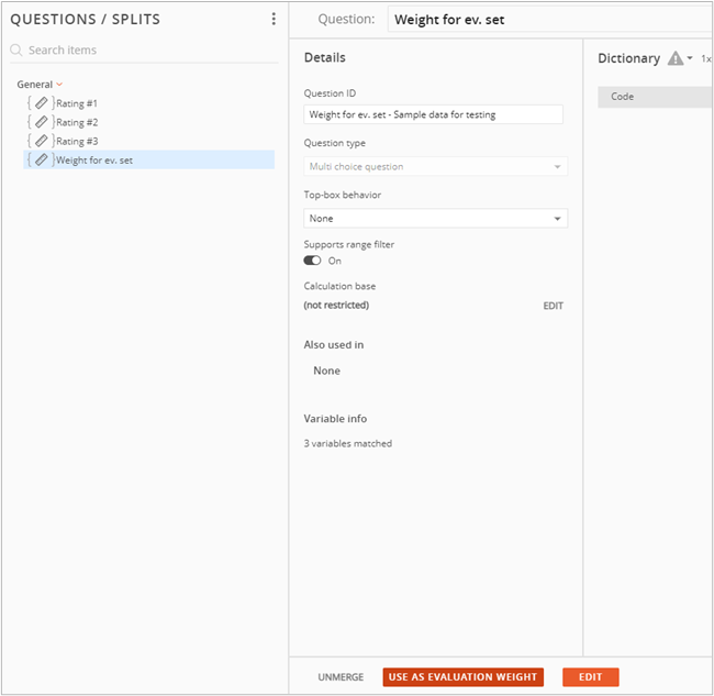 At this point, the variables intended to be used as weights in the evaluation set are still numeric questions.